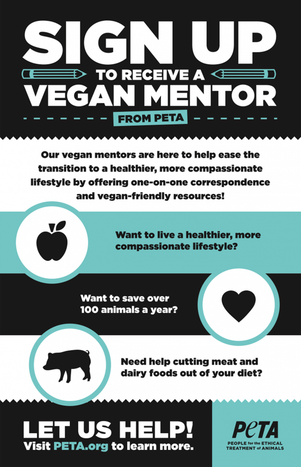 • Sign up for PETA’s free Vegan Mentor Program, which helps young people ease into a vegan lifestyle by providing one-on-one support from a personal vegan coach.