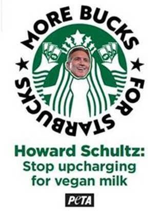 Heads up, Howard! This Sunday, members of PETA and Animal Rights Initiative (ARI) will be unmissable outside Starbucks CEO Howard Schultz’s lakeside gated community, bearing giant photos of his face and calling him out for charging customers extra for the animal-friendly vegan milks the company already agrees are better for the planet. Starbucks gave former CEO Kevin Johnson a $60 million payout when he stepped down in March, which alone could have offset nearly 86 million 70-cent vegan milk upcharges.