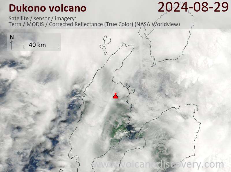 Veröffentlicht am 2024-08-29 von global-affairDukono Volcano Volcanic Ash Advisory: VA TO FL080 OBS AT 28/1740Z EXTD W EST VA DTG: 29/0520Z to 8000 ft (2400 m) Satellite image of Dukono volcano on 29 Aug 2024