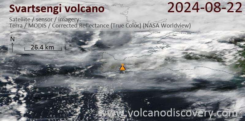 Veröffentlicht am 2024-08-22 von global-affairSvartsengi Volcano Volcanic Ash Advisory: ONGOING IN THE SUNDHNUKAR CRATER. Satellite image of Svartsengi volcano on 22 Aug 2024