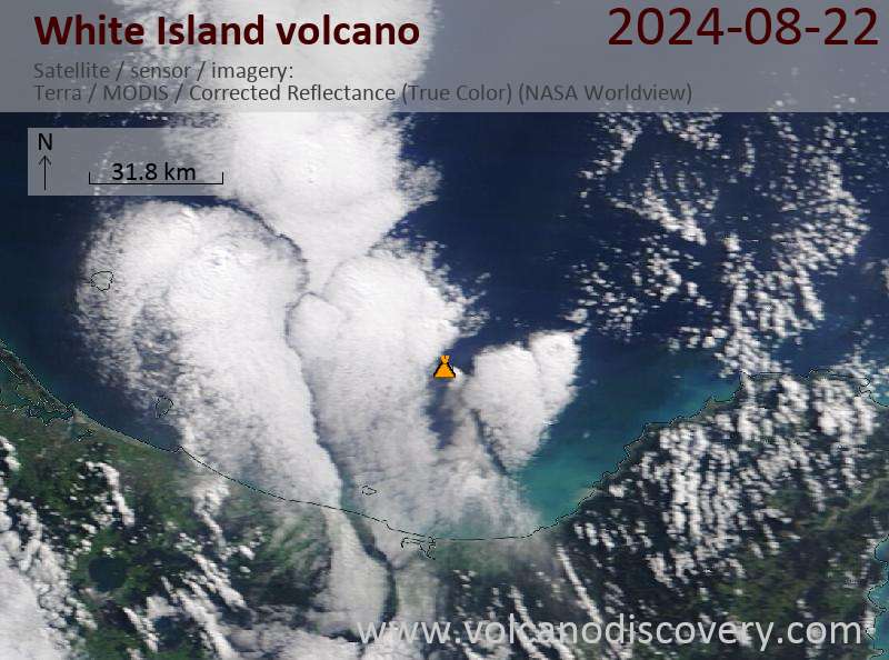 Veröffentlicht am 2024-08-23 von global-affairWhite Island Volcano Volcanic Ash Advisory: ERUPTION AT 20240812/1320Z CONTINUOUS LOW LEVEL ERUPTION to 6000 ft (1800 m) Satellite image of White Island volcano on 23 Aug 2024