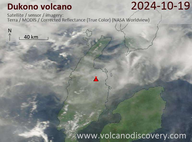 Veröffentlicht am 2024-10-19 von global-affairDukono Volcano Volcanic Ash Advisory: VA TO FL090 OBS AT 18/2330Z EXT NE EST VA DTG: 19/0430Z to 9000 ft (2700 m) Satellite image of Dukono volcano on 19 Oct 2024