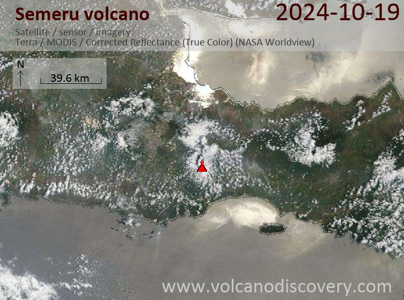 Veröffentlicht am 2024-10-19 von global-affairSemeru Volcano Volcanic Ash Advisory: VA TO FL140 LAST REPORTED AT 19/1427Z EST VA DTG: 19/1510Z to 14000 ft (4300 m) Satellite image of Semeru volcano on 19 Oct 2024