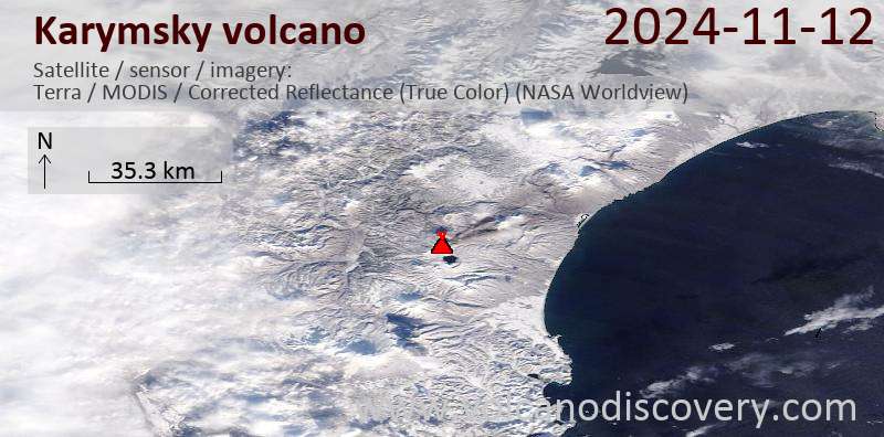 Veröffentlicht am 2024-11-12 von global-affairKarymsky Volcano Volcanic Ash Advisory: POSS ERUPTION OBS AT 20241112/0150Z FL100 EXTD E OBS VA DTG: 12/0210Z to 10000 ft (3000 m) Satellite image of Karymsky volcano on 12 Nov 2024