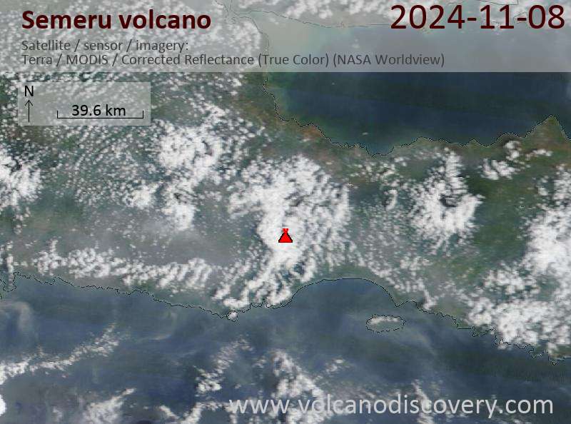 Veröffentlicht am 2024-11-08 von global-affairSemeru Volcano Volcanic Ash Advisory: VA TO FL130 REPORTED AT 08/1213Z MOV SW EST VA DTG: 08/1910Z to 13000 ft (4000 m) Satellite image of Semeru volcano on 8 Nov 2024