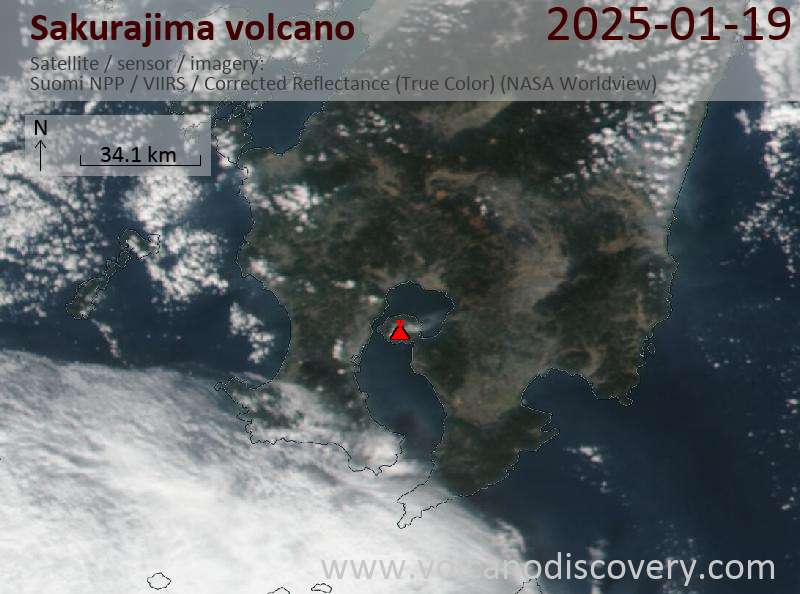 Veröffentlicht am 2025-01-20 von global-affairSakurajima Volcano Volcanic Ash Advisory: EXPLODED AT 20250119/2342Z OVER FL070 EXTD SE OBS VA DTG: 19/2330Z Satellite image of Sakurajima volcano on 19 Jan 2025