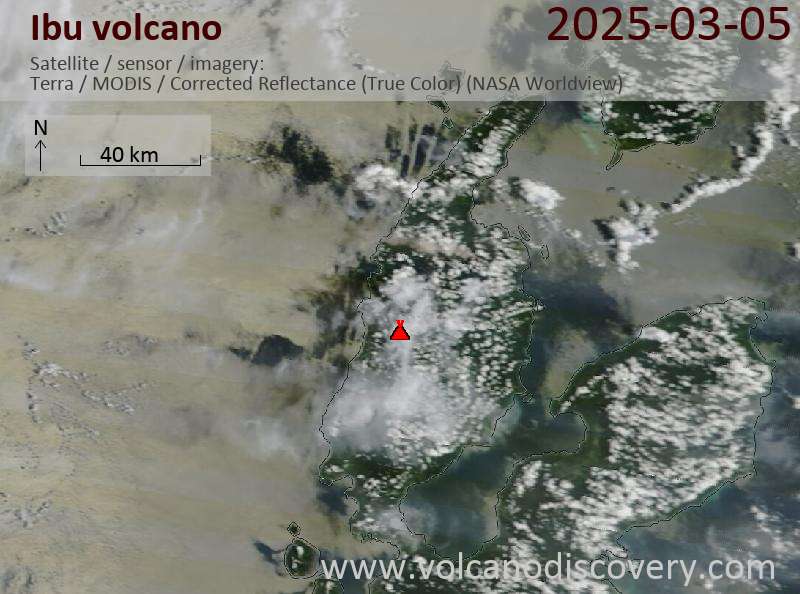 Veröffentlicht am 2025-03-05 von global-affairIbu Volcano Volcanic Ash Advisory: VA TO FL080 LAST REP AT 05/0918Z EST VA DTG: 05/1030Z to 8000 ft (2400 m) Satellite image of Ibu volcano on 5 Mar 2025