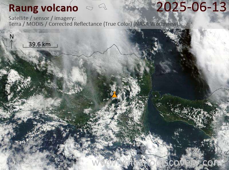 Veröffentlicht am 2025-06-14 von global-affairRaung Volcano Volcanic Ash Advisory: VA TO FL140 EXTENDING SSW OBS VA DTG: 13/2320Z to 14000 ft (4300 m) Satellite image of Raung volcano on 14 Jun 2025
