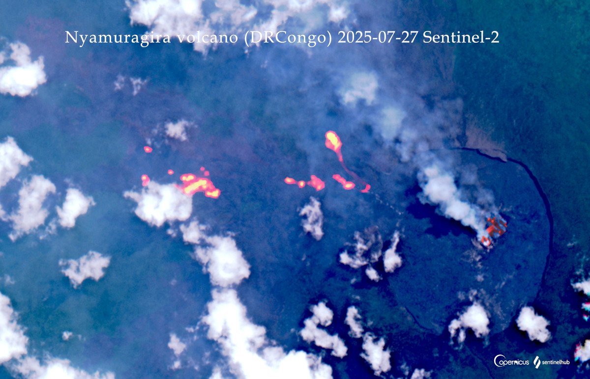 The lava continues to keep the flow active that emerges from the summit lava lake as detectable from the latest Sentinel-2 satellite acquisition on 27 July.