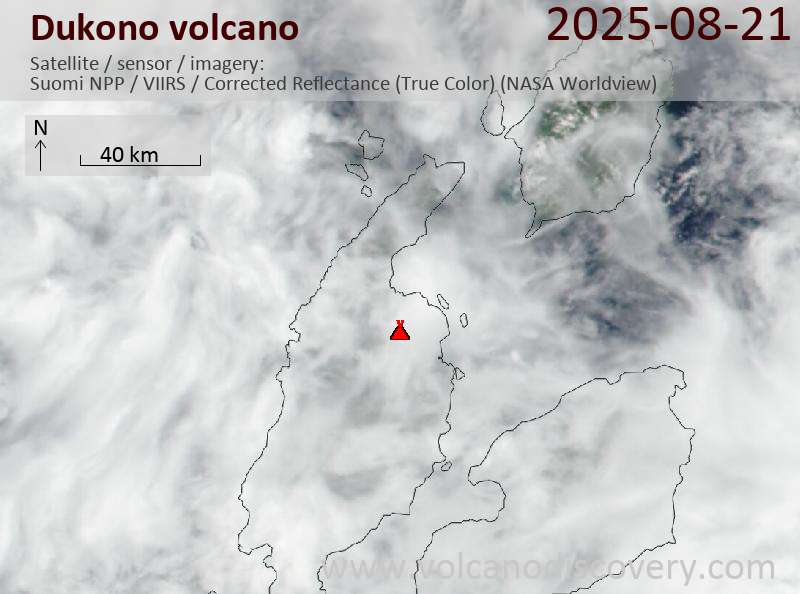 Veröffentlicht am 2025-08-21 von global-affairDukono Volcano Volcanic Ash Advisory: VA TO FL060 EXT NW LAST REPORTED 21/0905Z EST VA DTG: 21/1600Z to 6000 ft (1800 m) Satellite image of Dukono volcano on 21 Aug 2025