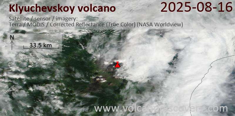 Satellite image of Klyuchevskoy volcano on 16 Aug 2025