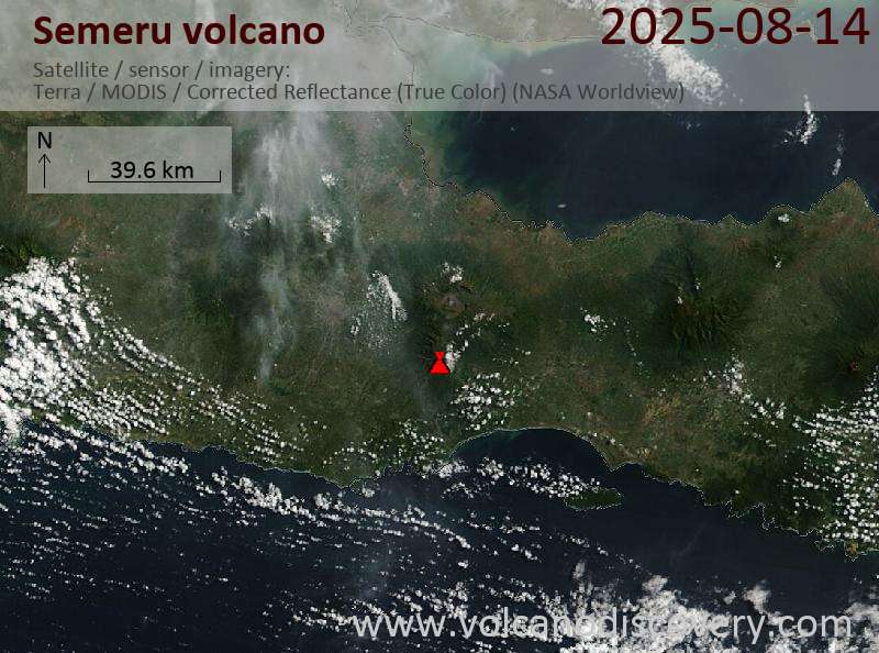 Veröffentlicht am 2025-08-14 von global-affairSemeru Volcano Volcanic Ash Advisory: VA TO FL150 OBS AT 14/0830Z MOV E EST VA DTG: 14/0930Z to 15000 ft (4600 m) Satellite image of Semeru volcano on 14 Aug 2025