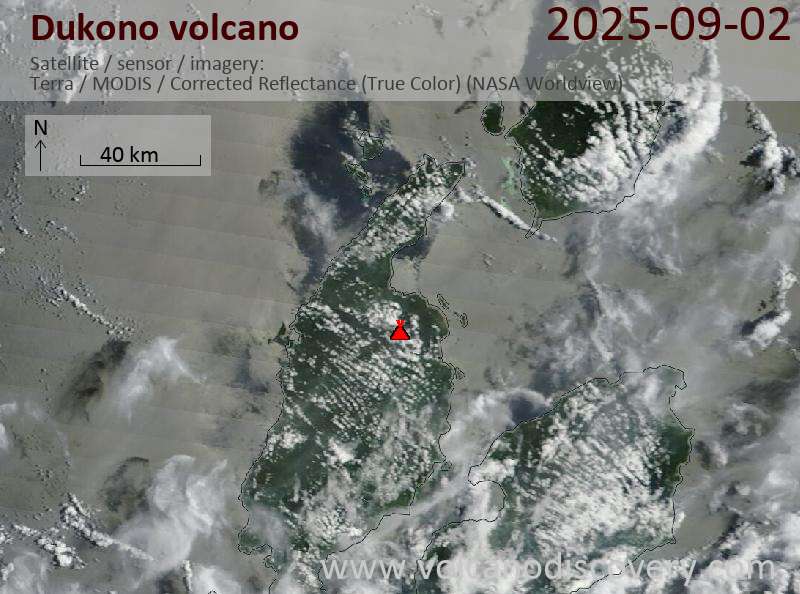 Veröffentlicht am 2025-09-02 von global-affairDukono Volcano Volcanic Ash Advisory: VA TO FL060 MOV NW REPORTED FM GND 02/0922Z to 6000 ft (1800 m) Satellite image of Dukono volcano on 2 Sep 2025