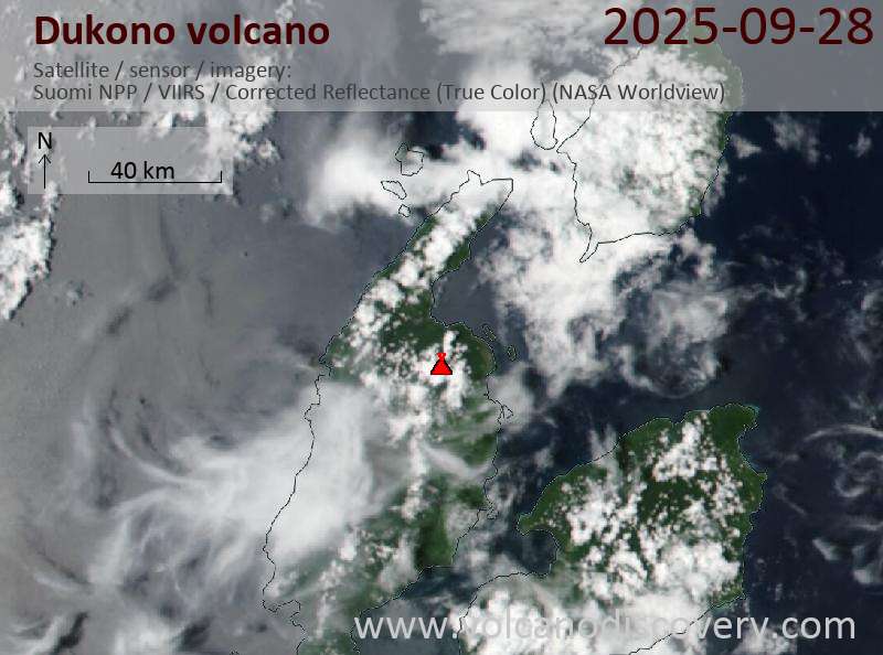 Veröffentlicht am 2025-09-28 von global-affairDukono Volcano Volcanic Ash Advisory: VA TO FL060 REPORTED FM GND AT 28/0928Z MOV NW to 6000 ft (1800 m) Satellite image of Dukono volcano on 28 Sep 2025