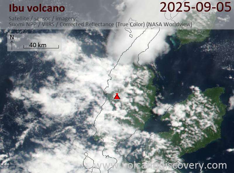 Veröffentlicht am 2025-09-05 von global-affairIbu Volcano Volcanic Ash Advisory: VA TO FL070 LAST REP AT 05/1217Z EST VA DTG: 05/1340Z to 7000 ft (2100 m) Satellite image of Ibu volcano on 5 Sep 2025