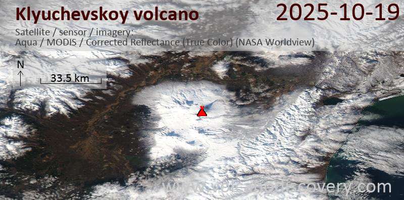 Veröffentlicht am 2025-10-19 von global-affairKlyuchevskoy Volcano Volcanic Ash Advisory: VA AT 20251019/1948Z FL200 EXTD NE MOV 10KT REPORTED Satellite image of Klyuchevskoy volcano on 19 Oct 2025