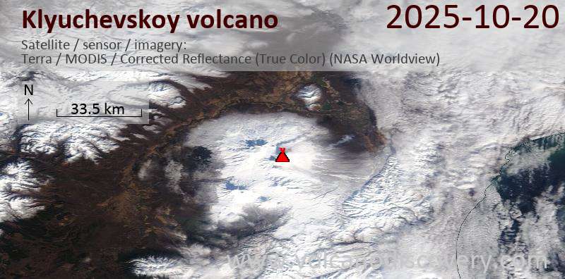 Veröffentlicht am 2025-10-20 von global-affairKlyuchevskoy Volcano Volcanic Ash Advisory: VA AT 20251020/0530Z FL170 EXTD ENE MOV 10KT REPORTED Satellite image of Klyuchevskoy volcano on 20 Oct 2025