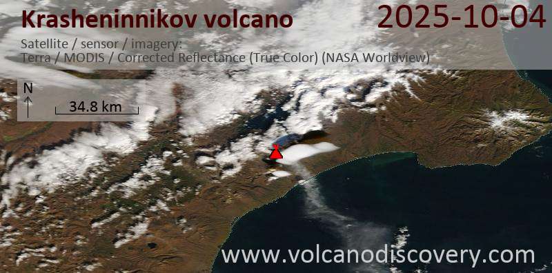 Veröffentlicht am 2025-10-04 von global-affairKrasheninnikov Volcano Volcanic Ash Advisory: VA EMISSIONS CONTINUING OBS VA DTG: 04/0520Z to 8000 ft (2400 m) Satellite image of Krasheninnikov volcano on 4 Oct 2025