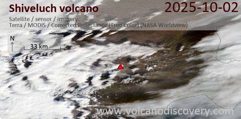 Veröffentlicht am 2025-10-02 von global-affairShiveluch Volcano Volcanic Ash Advisory: POSS ERUPTION OBS AT 20251002/2050Z FL150 EXTD E OBS VA DTG: 02/2200Z to 15000 ft (4600 m) Satellite image of Shiveluch volcano on 2 Oct 2025