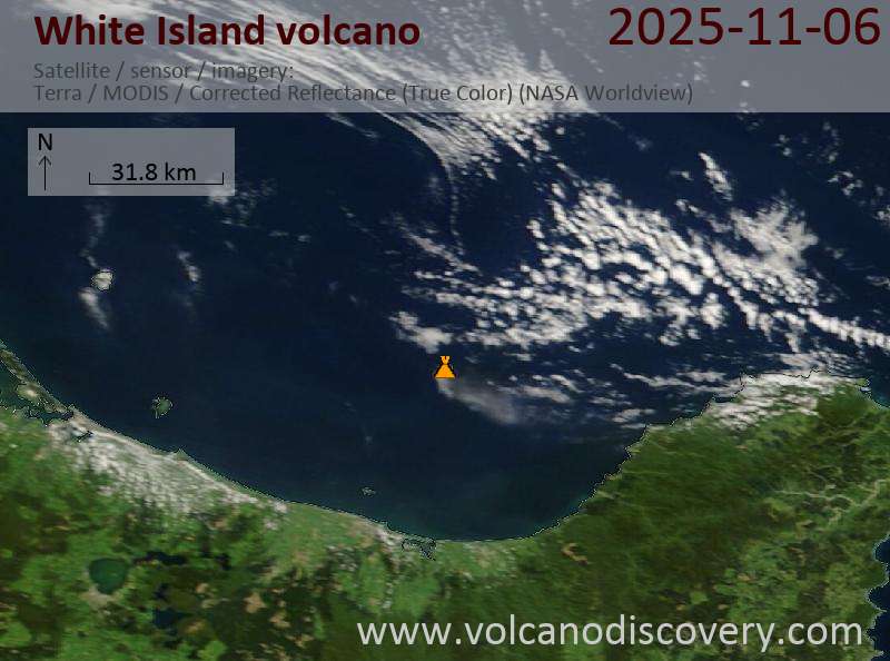 Veröffentlicht am 2025-11-06 von global-affairWhite Island Volcano Volcanic Ash Advisory: ERUPTION AT 20251106/0120Z INTERMITTENT LOW LEVEL ERUPTION to 3000 ft (900 m) Satellite image of White Island volcano on 6 Nov 2025
