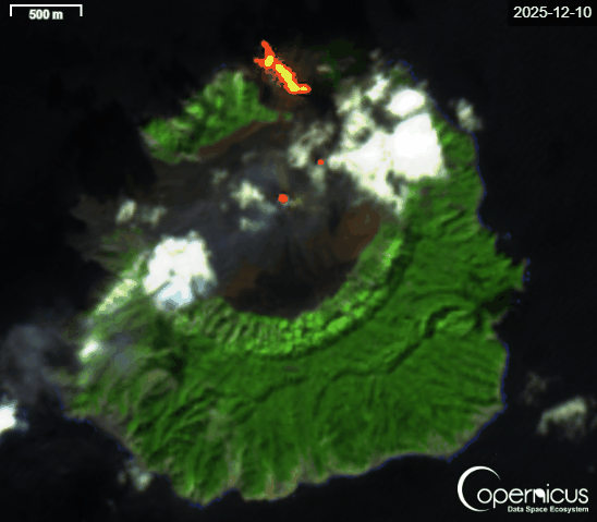 The effusive eruption at the volcano continues. A new lava flow started to emerge from the northern flank vent. It currently advances towards the northern coast, likely covering the surfaces created by previous lava flows.