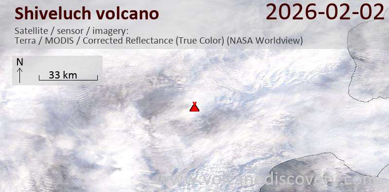 Satellite image of Shiveluch volcano on 2 Feb 2026