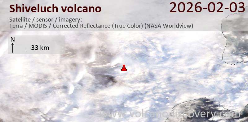 Satellite image of Shiveluch volcano on 3 Feb 2026