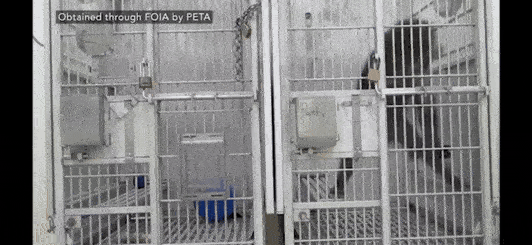 A baboon named Nikki, used in pregnancy experiments and confined to a cage at EVMS, rocks back and forth in psychological distress. Image obtained from this video by PETA through the Virginia Public Records Act