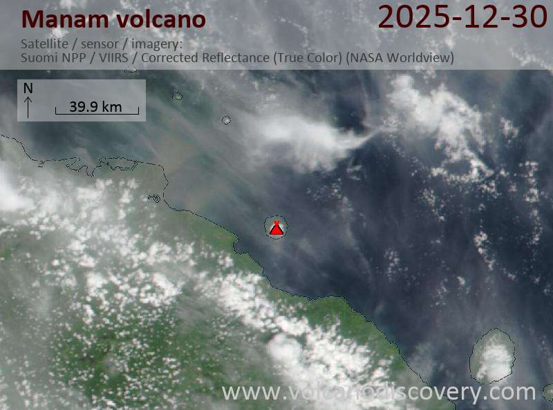 Explosive activity continues. Volcanic Ash Advisory Center (VAAC) Darwin warned about a volcanic ash plume that rose up to estimated 15000 ft (4600 m) altitude or flight level 150 and is moving at 10 kts in SE direction.